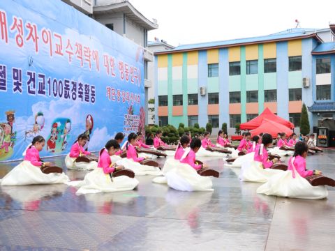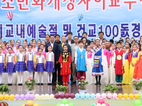 当天下午,学校第四届校园艺术节汇演活动中,广大学生、学校海棠花艺术团、教师、家长们一起喜着节日盛装同台献艺,共同庆祝本次课题研究阶段性成果展示会的隆重召开,以这种特别的形式共同庆祝珲春市第一实验小学校成立一百周年,珲春市第一实验小学校校长张京哲、珲春市教育局金英学副局长先后致辞,向来宾、离退休老教师、各级各界对学校和地区民族基础教育的关注支持表示感谢,随后百人大合唱、刀舞、象帽舞、伽倻琴齐奏、歌曲连唱、民族传统歌谣、民族团结歌舞大联欢等富有朝鲜族特色、彰显艺术课程教育最新成果、显示出民族大团结精神的多个精彩艺术曲目先后呈现,台上台下载歌载舞,喝彩声、掌声此起彼伏,整个校园处处洋溢着欢声笑语,营造了欢乐、祥和的节日氛围。